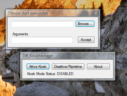 * In questa finestra, intitolata più o meno Choose executable, dovete selezionare, premendo il pulsante [Browse…], l’eseguibile che volete sia eseguito nella vostra postazione/chiosco. Se l’eseguibile necessita di parametri addizionali dovete trascriverli nel box sottostante, appunto Arguments.
