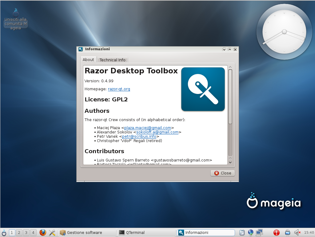 Some notes on the above packages: razor-qt packages has now reached an increased granularity and the metapackage task-razorqt was built to make user’s life easier. Moreover razorqt-panel look&feel it’s better integrated into the mageia thanks to a dedicated custom theme. Look at it yourself π